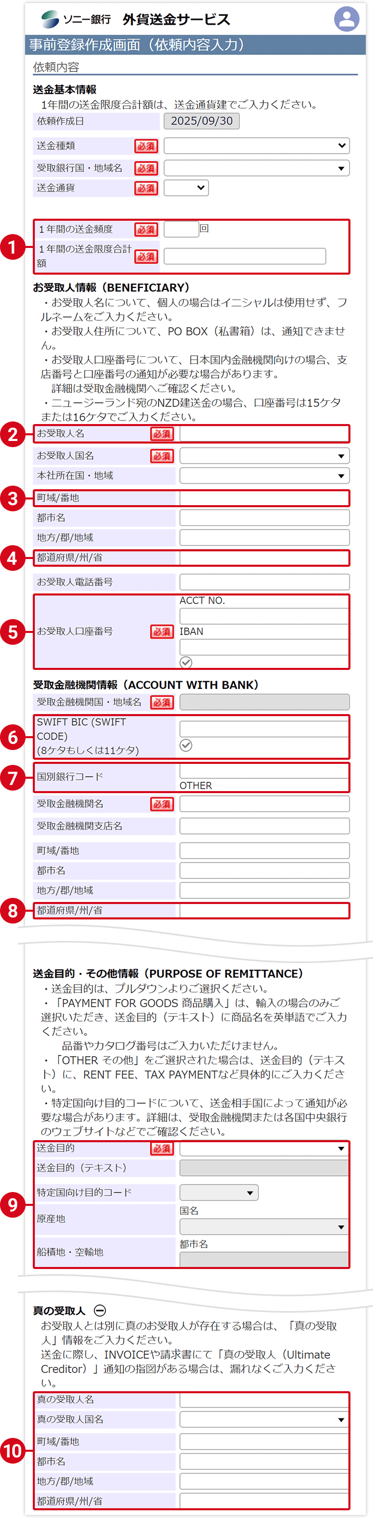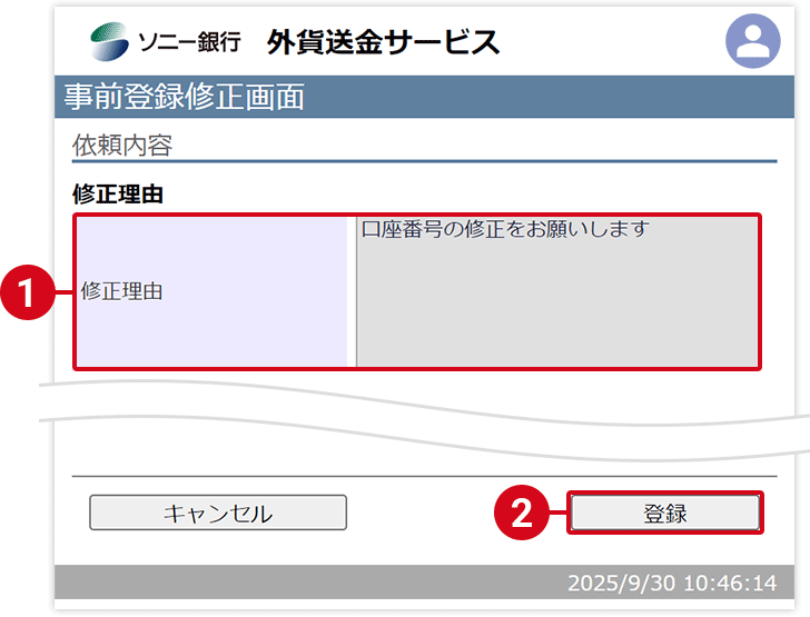 ご登録の内容または審査内容によっては、内容修正のお手続が発生する場合や、事前登録の完了・送金実行まで日数を要する場合がありますのでご注意ください。