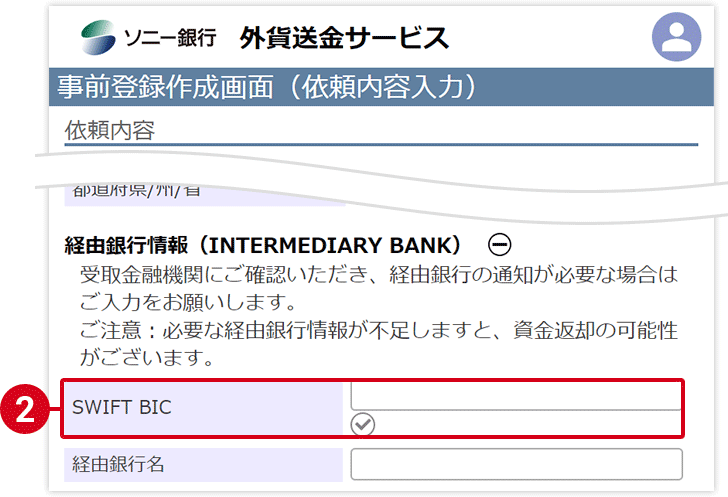 - 中継銀行および中継銀行のSWIFT BIC(中継銀行の指定がない場合は不要)
