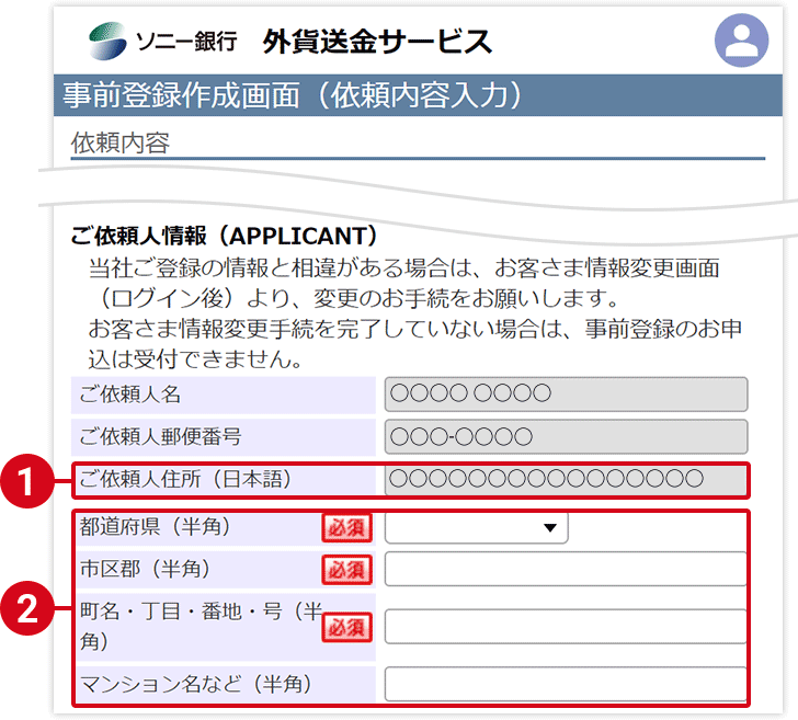 - 事前登録完了(メール受信)後、送金依頼を行ってください。原則、当社所定の審査後(2~5営業日後)にソニー銀行より送金を実行します。